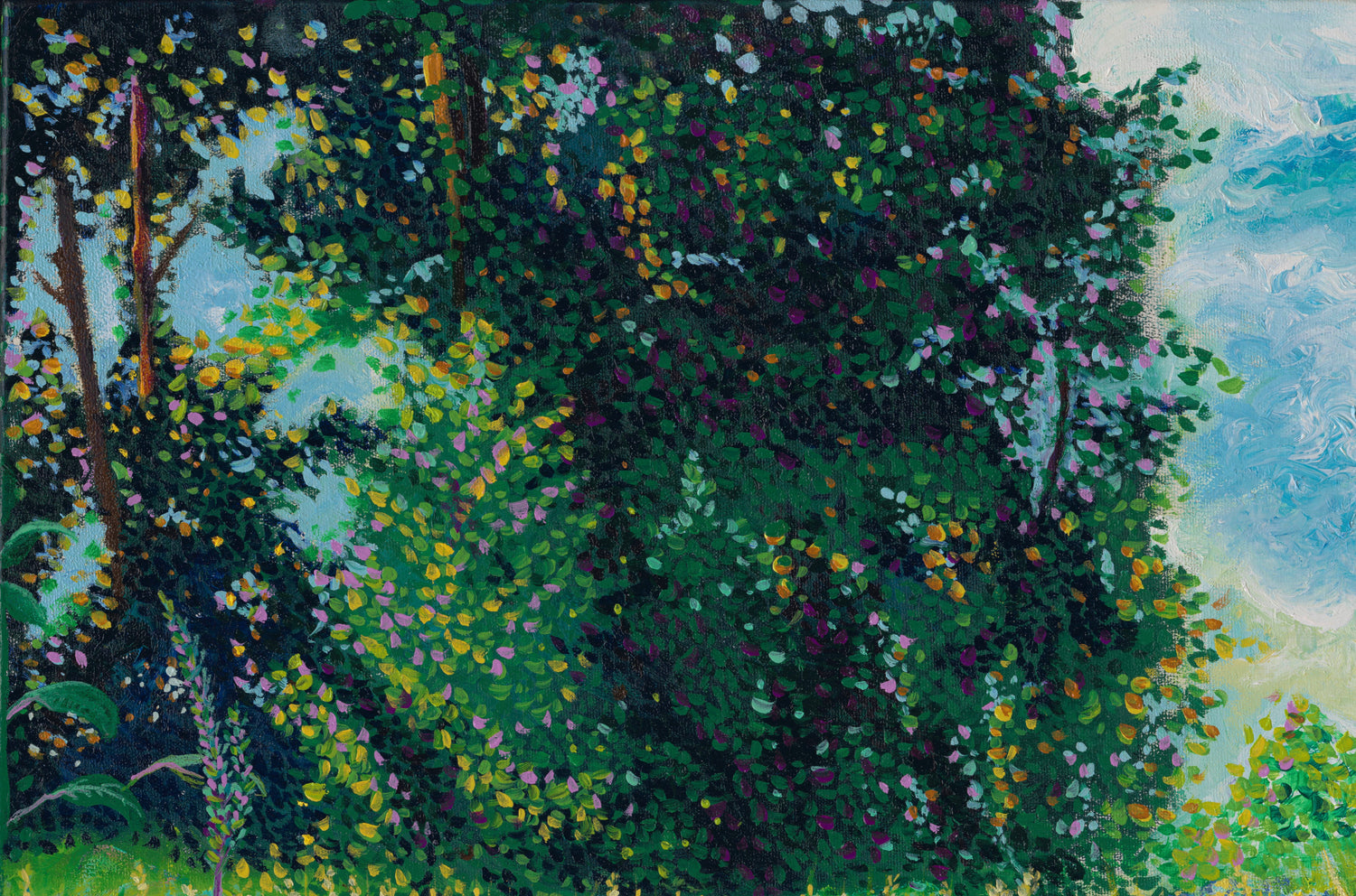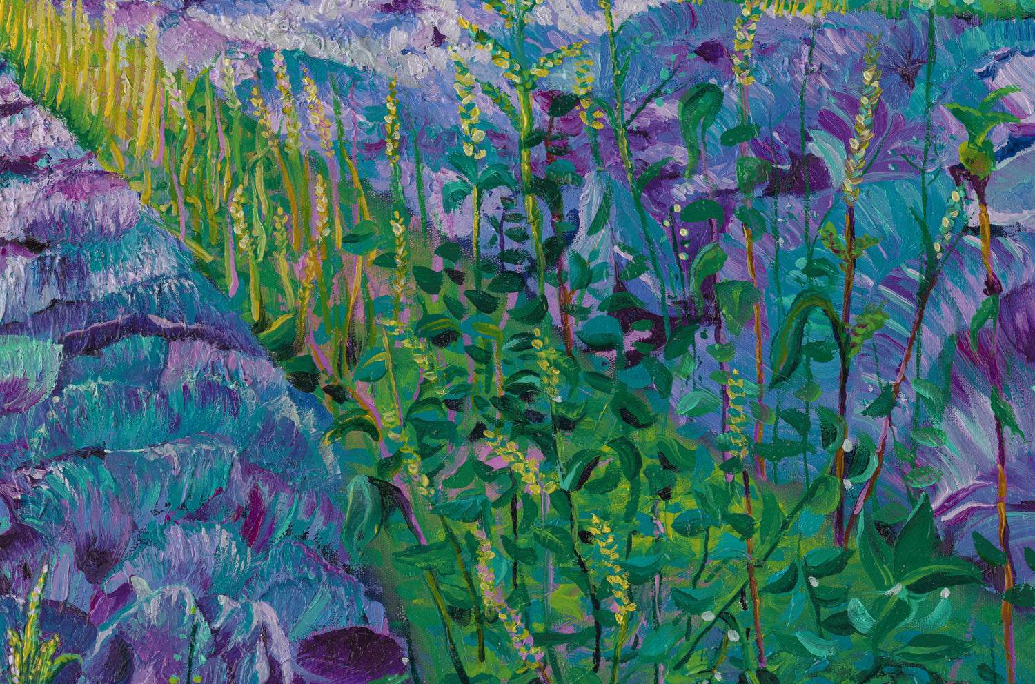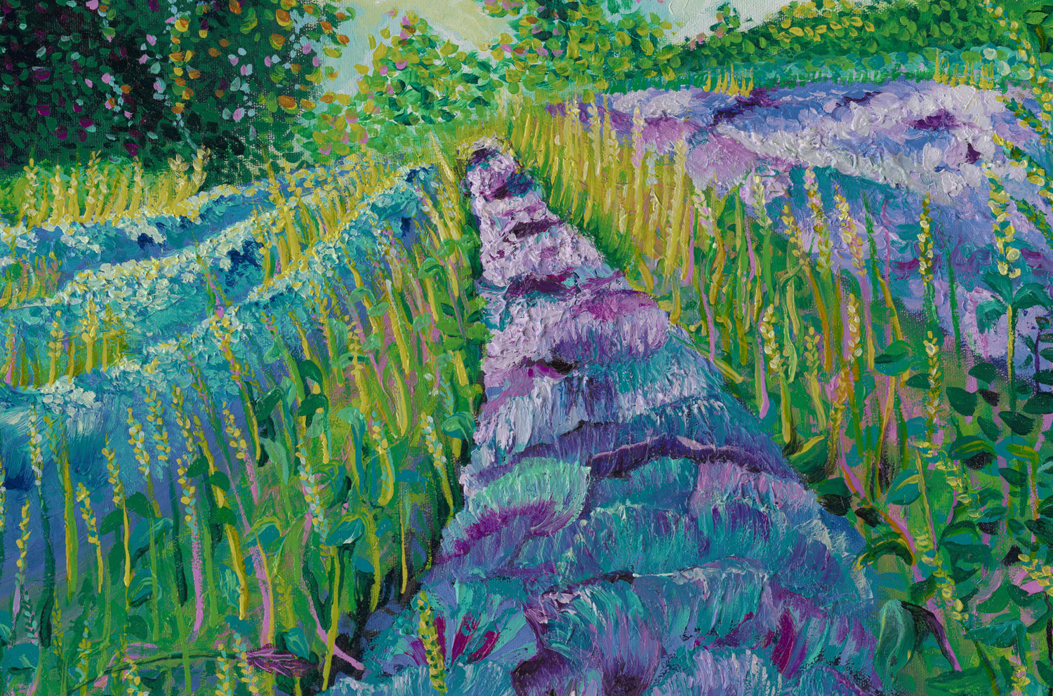 The painting is a cabbage field at Richmond Sunflower Festival, a celebration of flowers annually in Richmond, B.C. Naturally purple and turquoise cabbage leaves complement each other in an expression of love for nature, symbolizing the life that exudes from the field.
