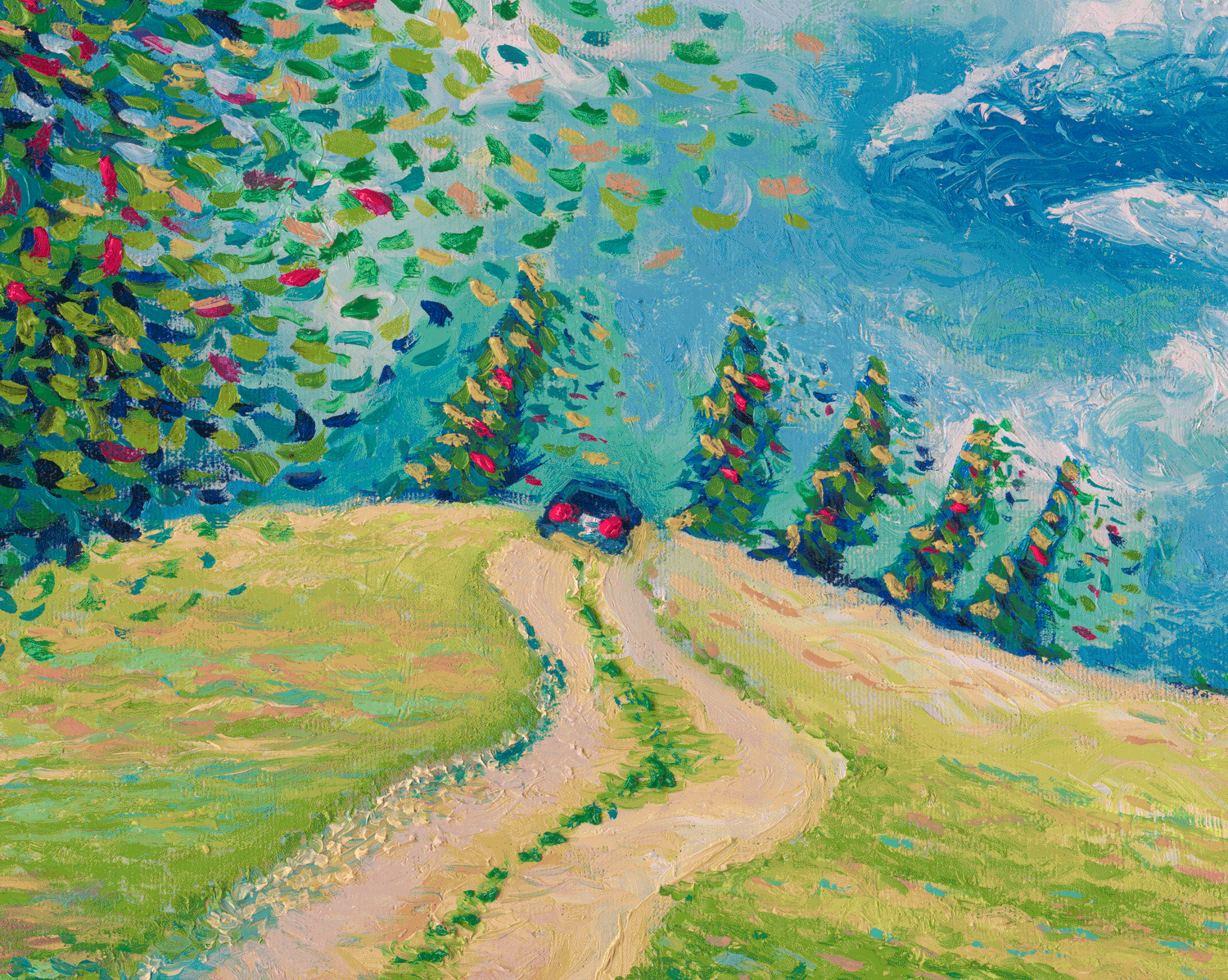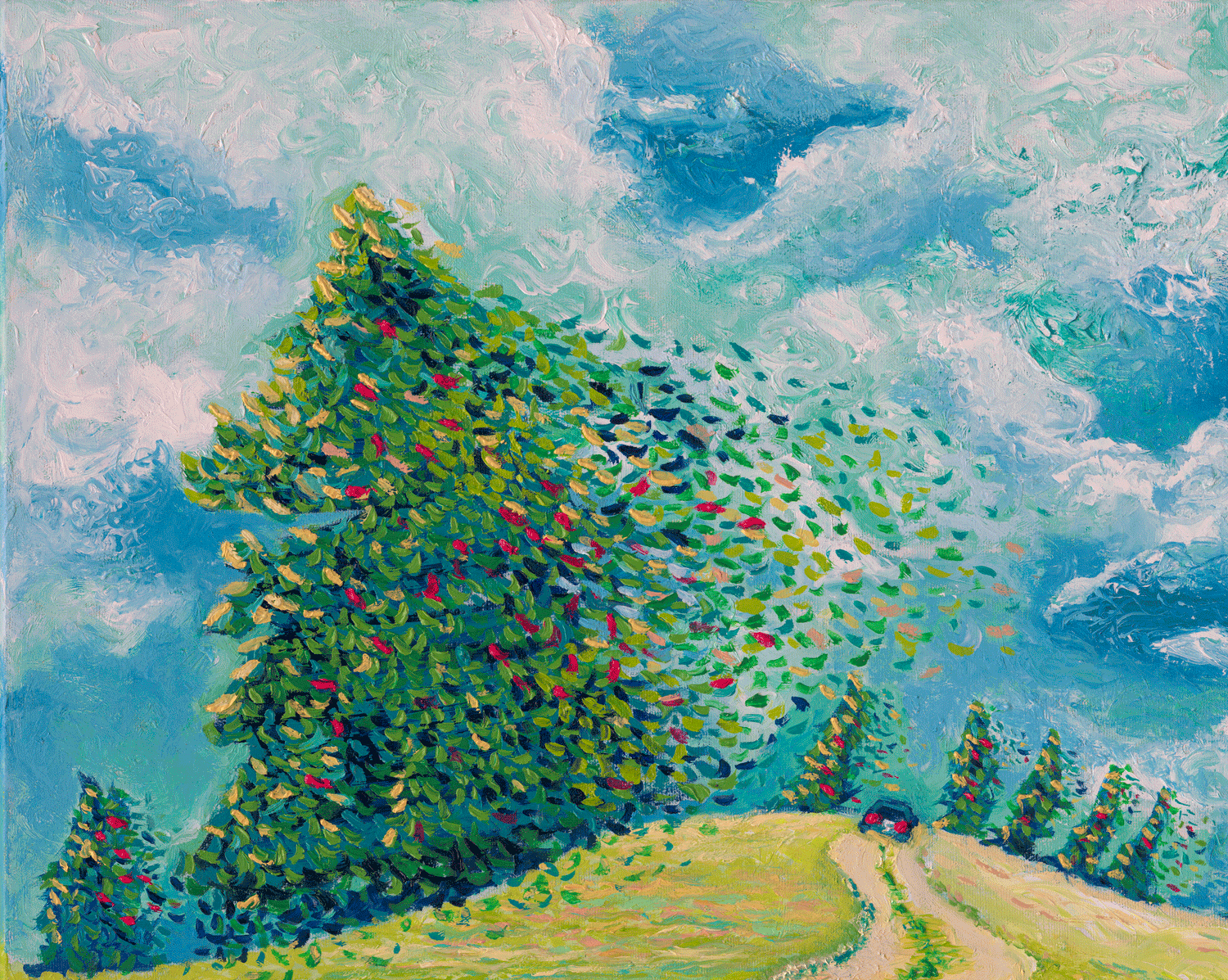 That first step leads us to a better place where our vision will become clearer. The painting was inspired by observing the entrance to the Richmond Sunflower Festival, a stunning celebration of flowers annually in Richmond, B.C. I chose to employ bright colors and caused the sky to concentrate in a variety of blue hues, while the trees, leaves, and lawn inclined toward the pathway. The painting is active, with the momentum of elements surrounding us creating positive energy, and encouraging joy within the landscape.