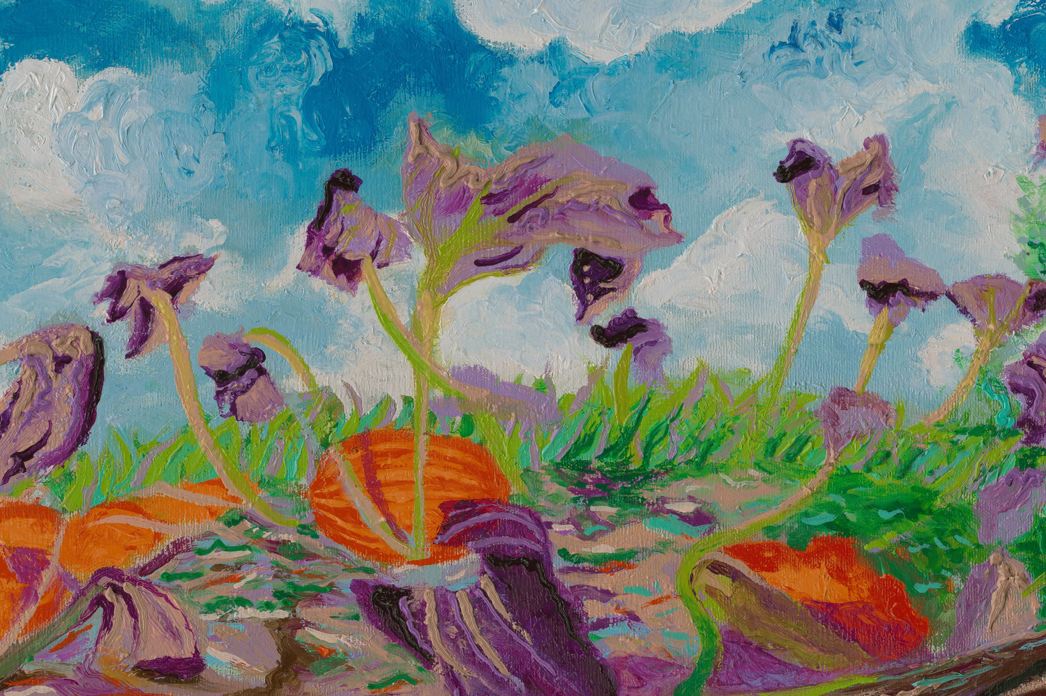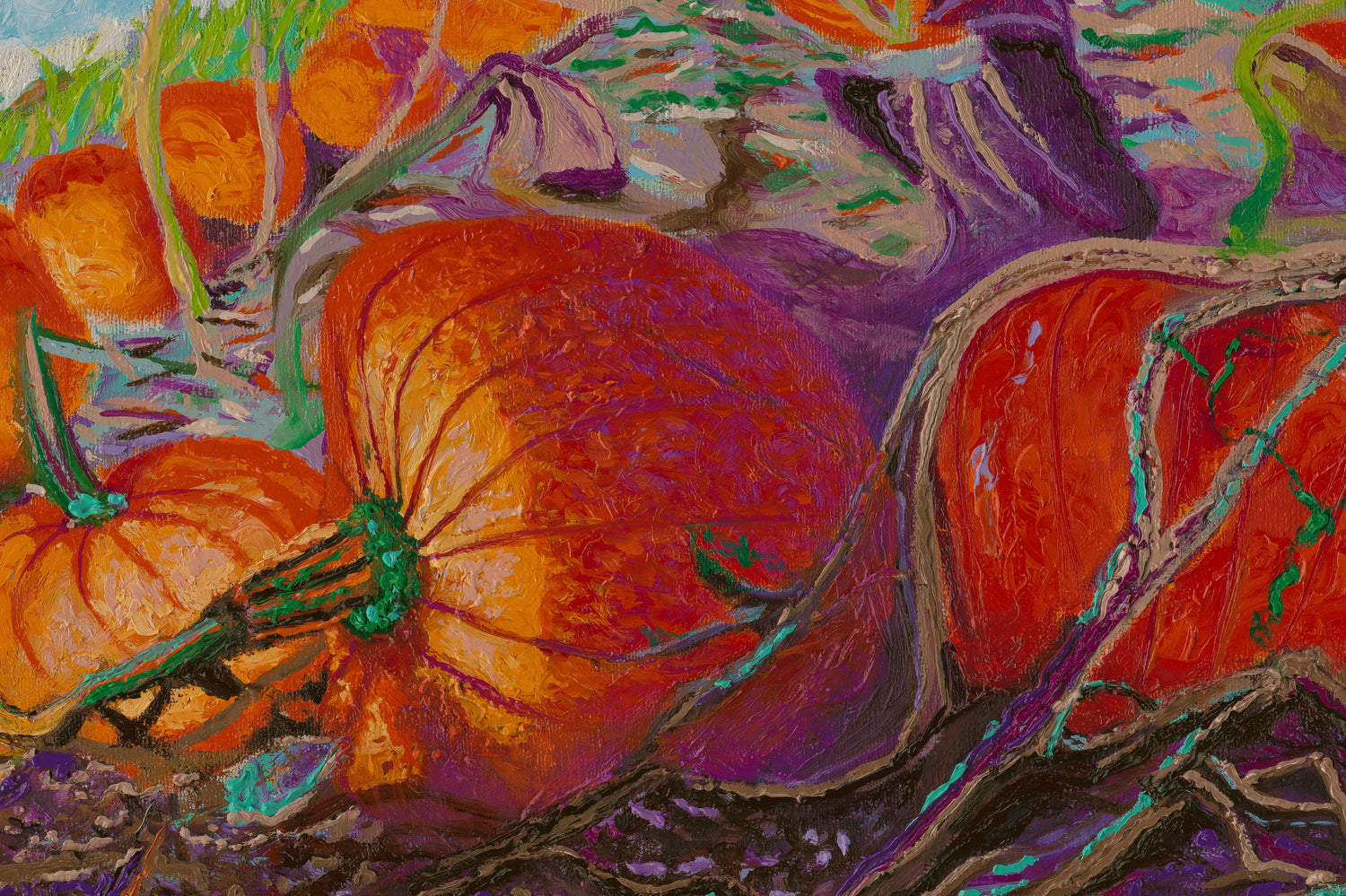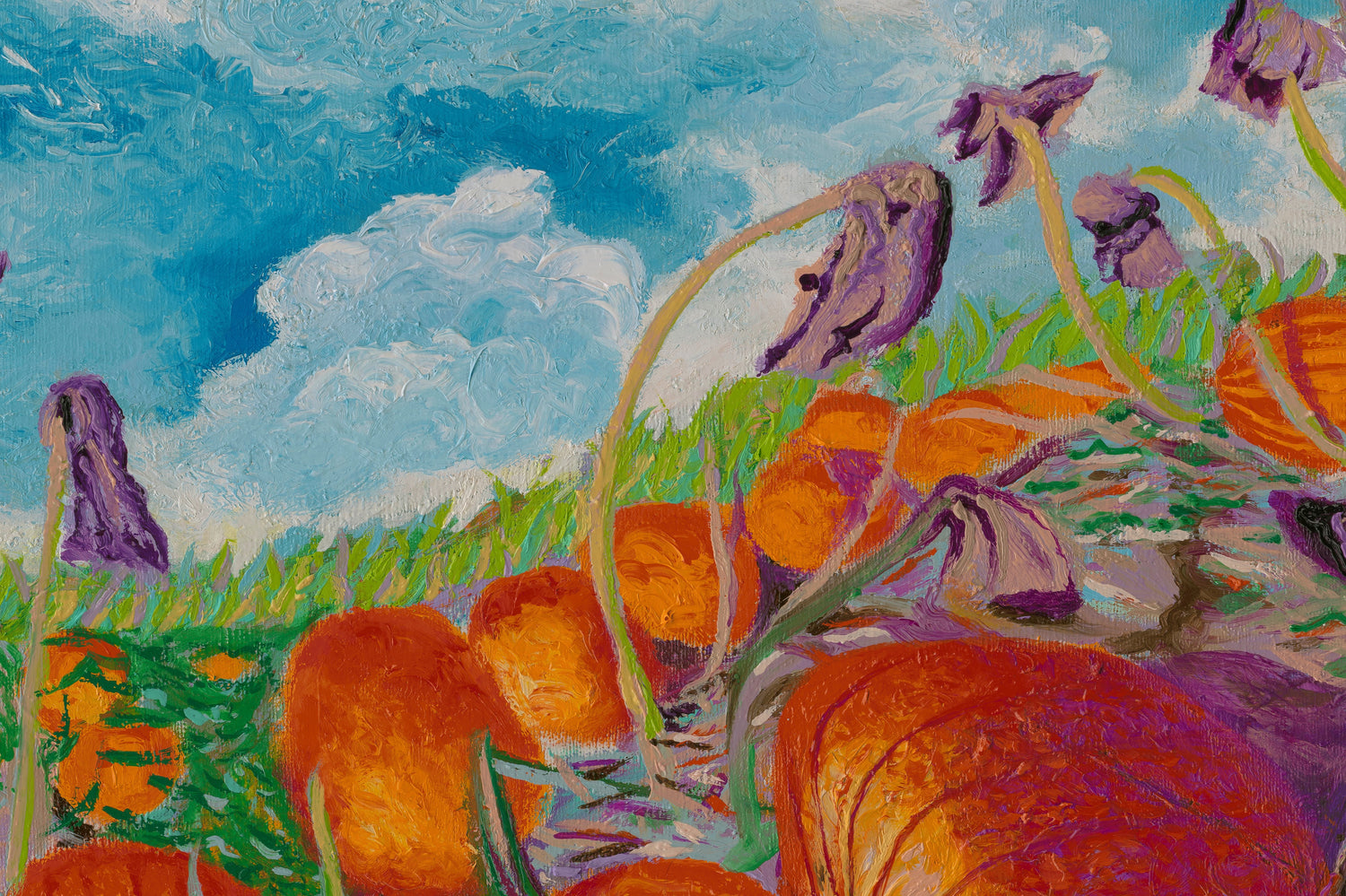 The painting is a pumpkin field at the Richmond Sunflower Festival, a celebration of flowers annually in Richmond, B.C. A pumpkin patch is captured from a distinct cross-sectional angle to achieve depth in the scene and enhance the actual size and colour of the subject to entice the viewer. Curves have been added to the grass, engendering a soothing calmness.