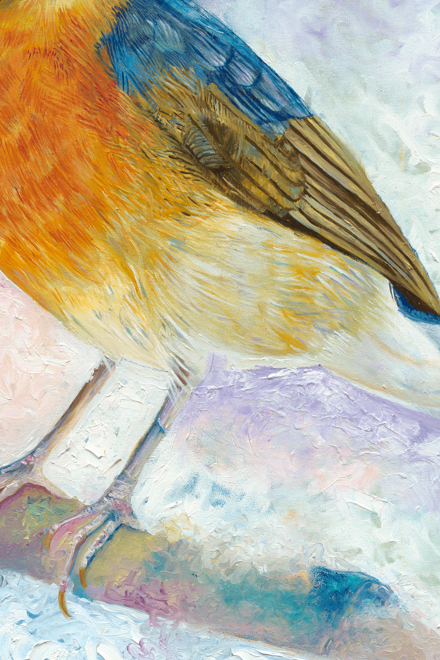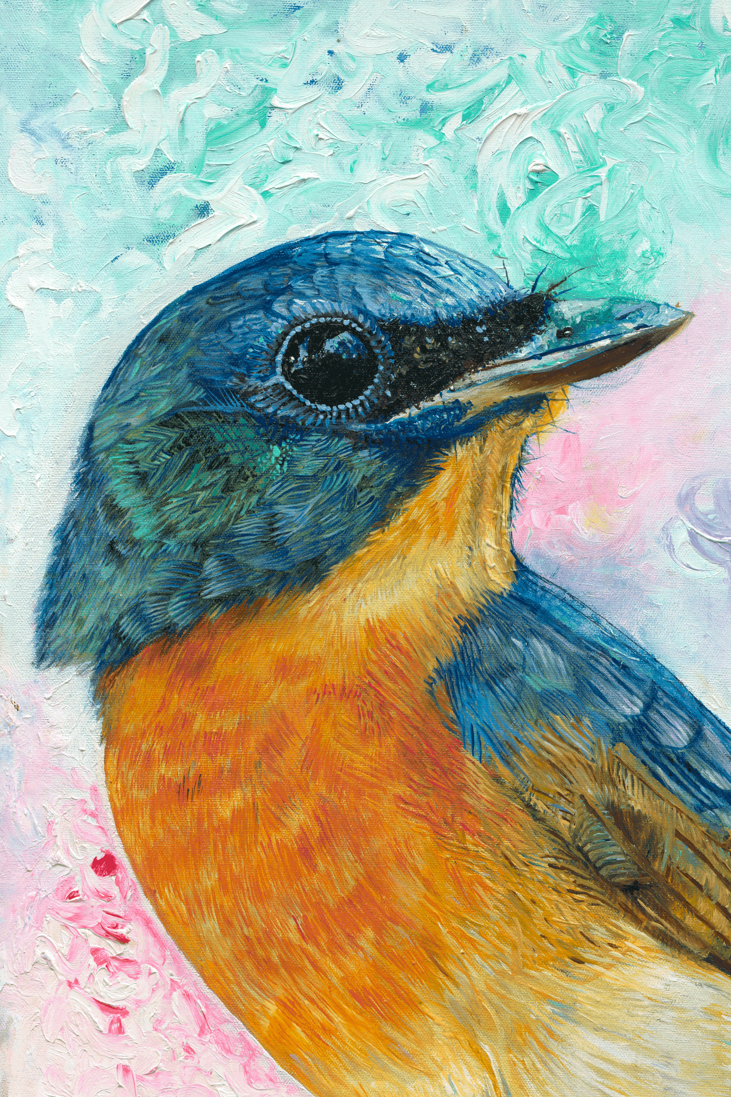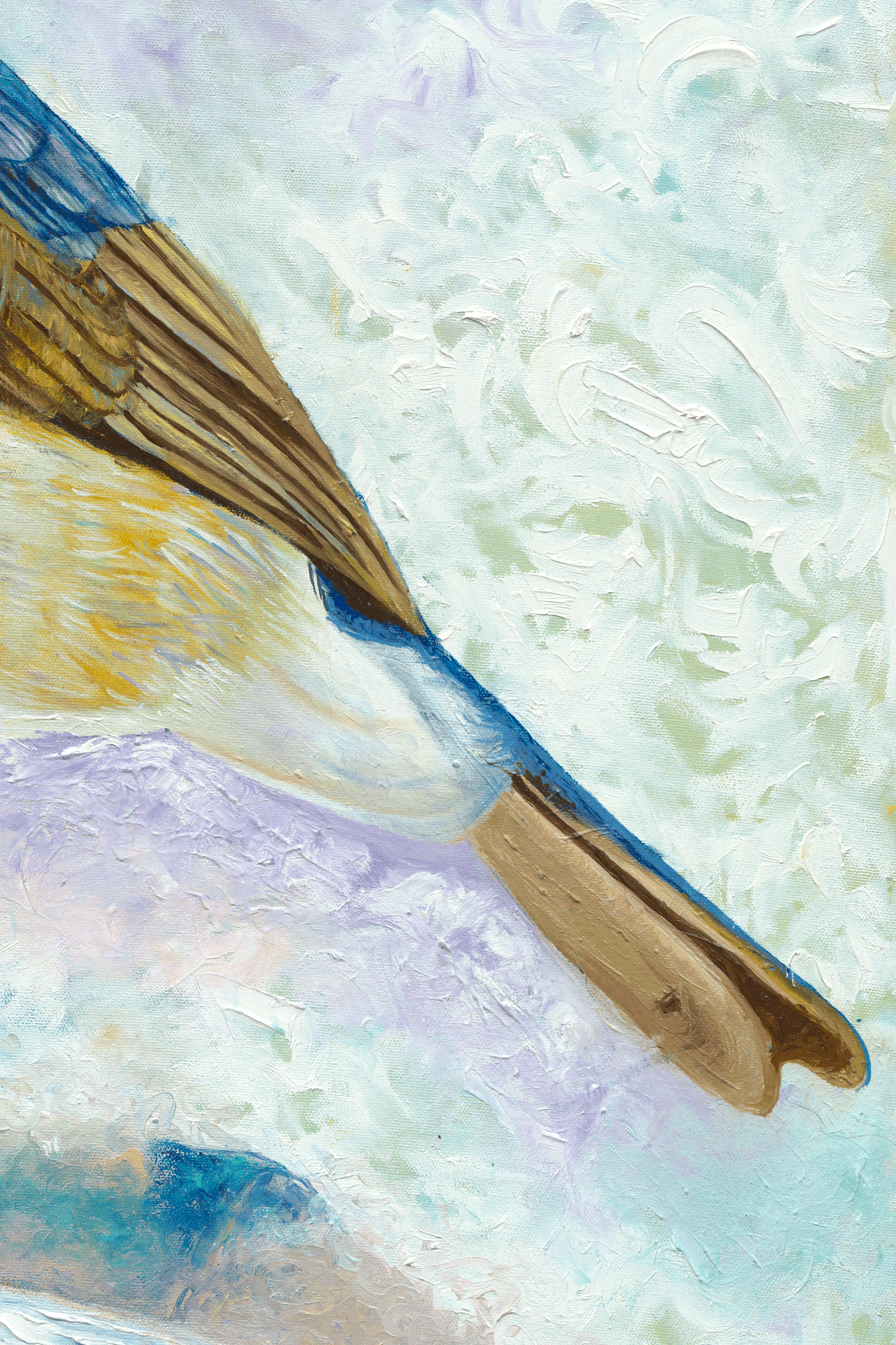 I used two layers of Gesso prior to painting and highly professional Holbein oil paint. My tools were paint brushes and finger strokes on Opus Canadian canvas.
