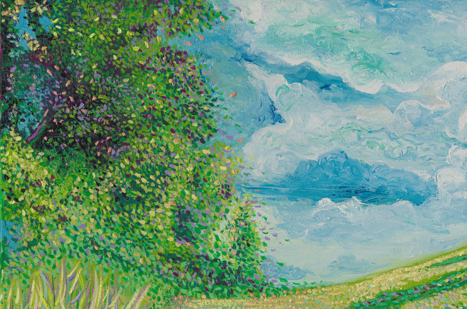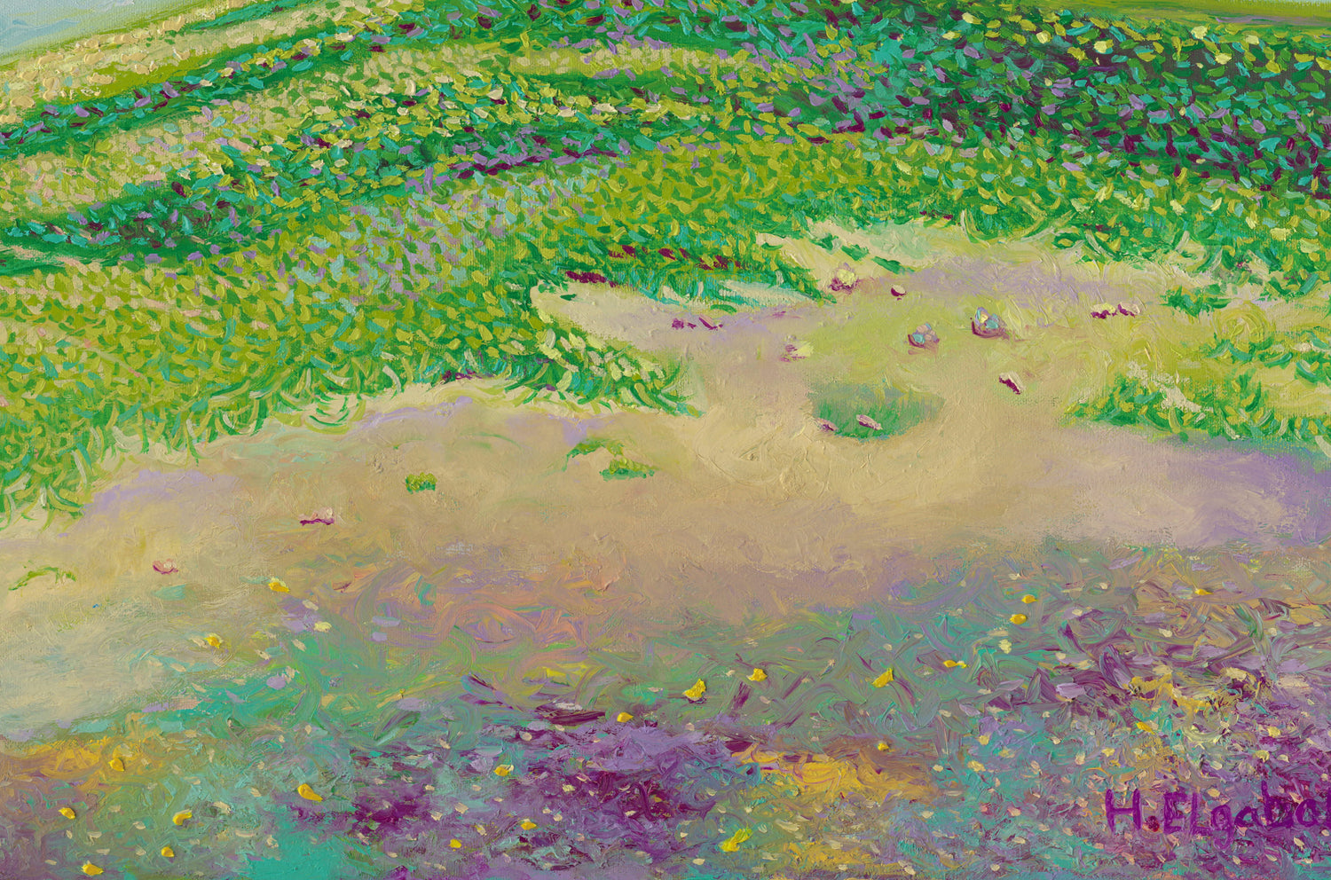 The painting was inspired by observing the entrance to the Richmond Sunflower Festival, a celebration of flowers annually in Richmond, B.C. The painting is a plethora of colors, regal shades of green, purple, and bright blue; which draw viewers into the fields of sun-bathed flowers framed by protective onlooking trees and blue sky.